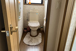 既設のトイレ周りの床が水を含んで表面がめくれてきている状況でした。貼り替えも考えましたが、お施主様の予算を考慮し、クッションフロアを貼ることを選択し施工させていただました。